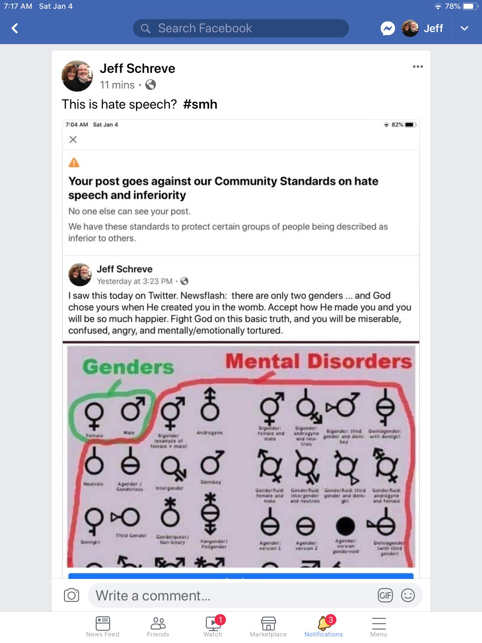 Un hombre publicó el siguiente meme en Facebook que le consiguió una cita de la policía del discurso de odio.